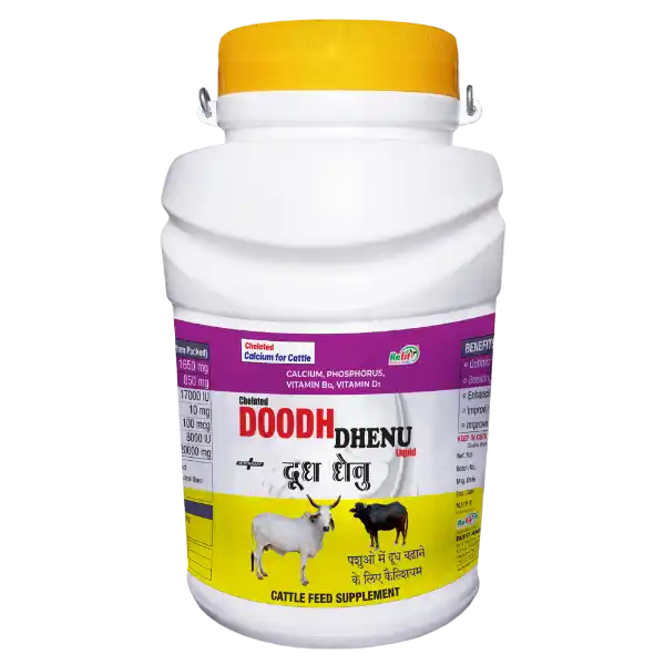 Doodh Dhenu is a revolutionary herbal chelated calcium supplement designed specifically for dairy animals like cows, buffaloes, goats, and sheep. It supports bone strength, milk production, muscle vitality, and overall immunity through a highly absorbable form of natural calcium.