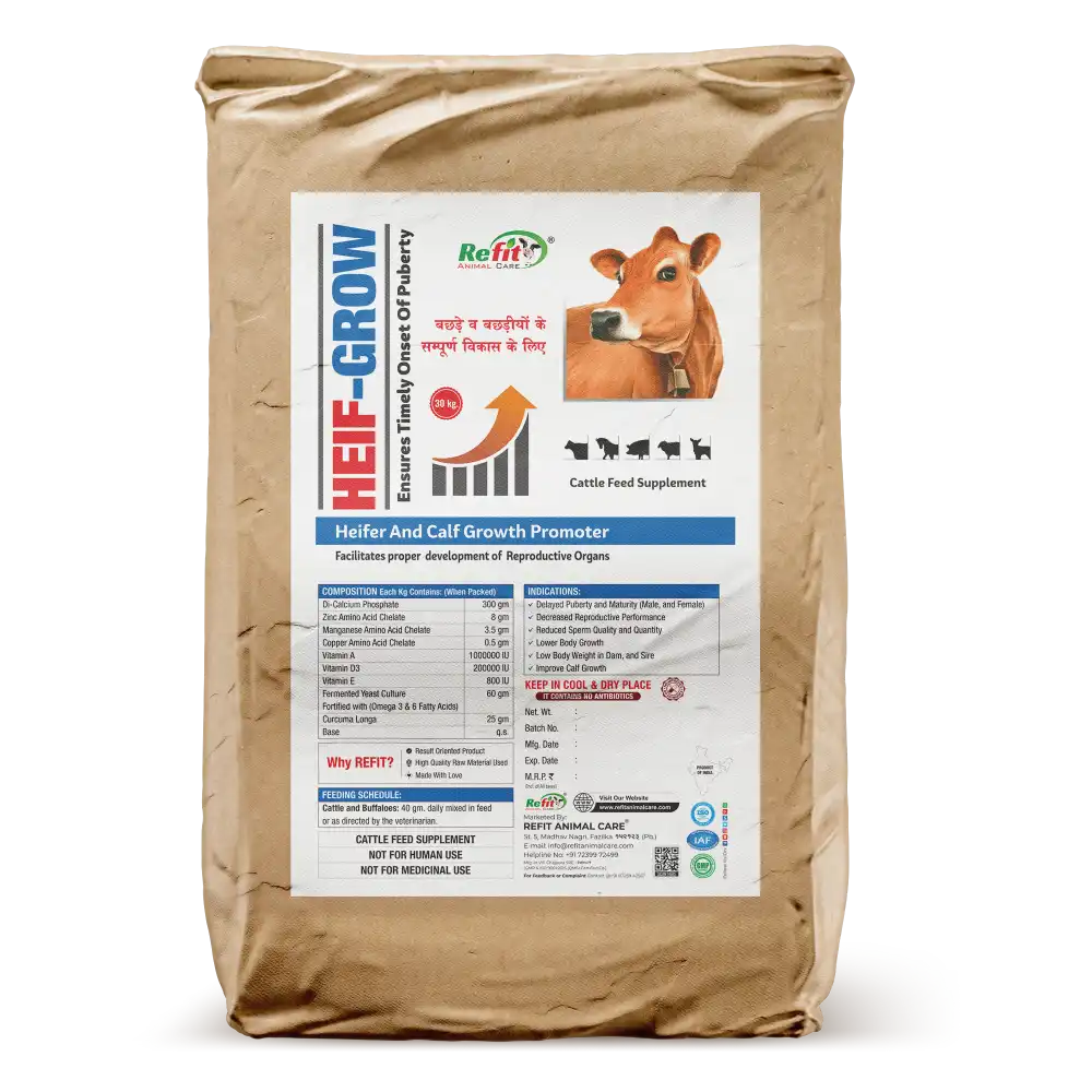 Heif-Grow is a scientifically formulated calf growth supplement designed to support the healthy development of dairy calves. Enriched with essential nutrients, it promotes stronger bones, better digestion, improved immunity, and faster muscle growth. Ideal for weaning and transition stages, Heif-Grow ensures a strong foundation for your young calves future productivity.