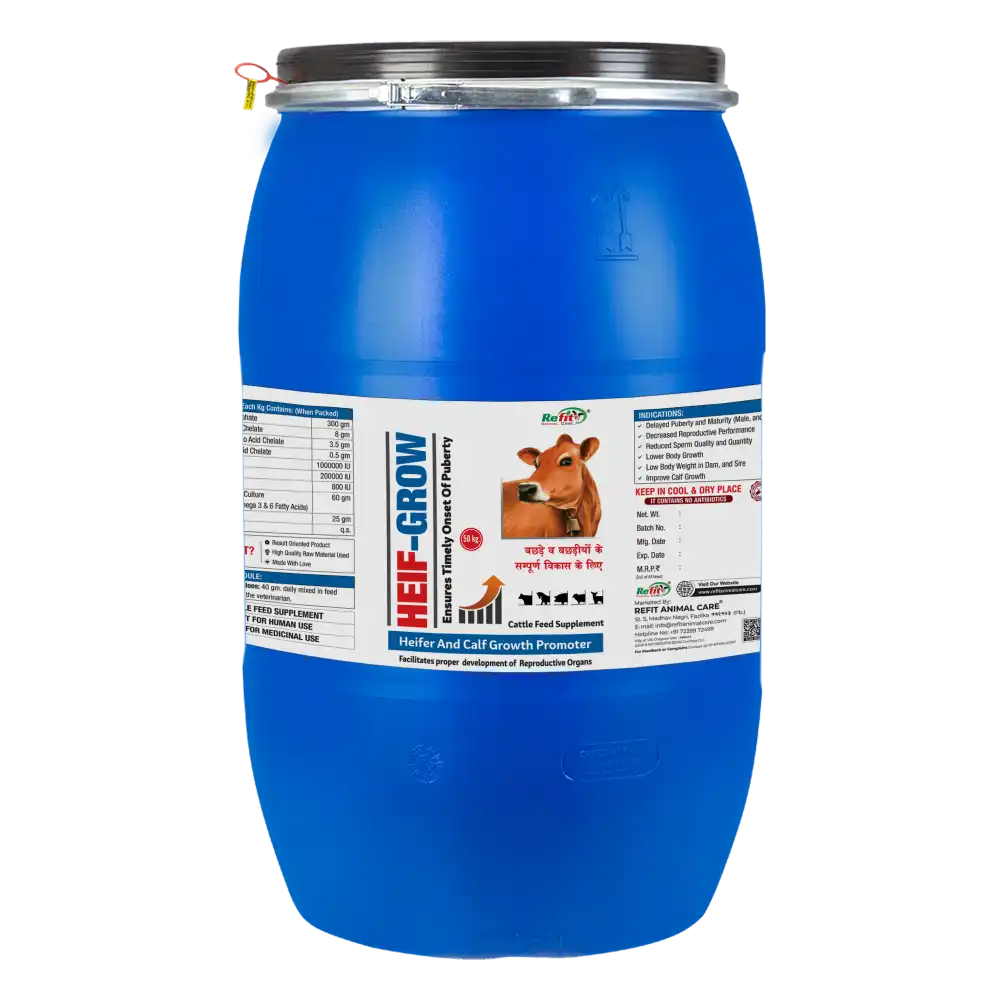 Heif-Grow is a scientifically formulated calf growth supplement designed to support the healthy development of dairy calves. Enriched with essential nutrients, it promotes stronger bones, better digestion, improved immunity, and faster muscle growth. Ideal for weaning and transition stages, Heif-Grow ensures a strong foundation for your young calves future productivity.