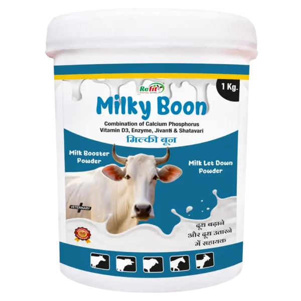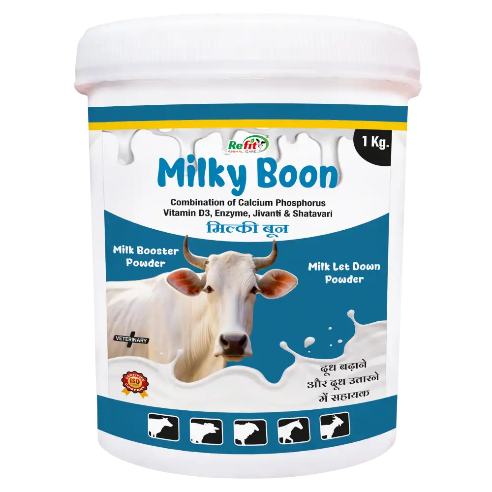 Milkyboon Powder is a premium nutritional supplement designed to support overall health, fertility, and milk productivity in cattle. Enriched with essential vitamins, minerals, and amino acids, it helps optimize performance, immunity, and reproductive efficiency in cows and bulls alike.