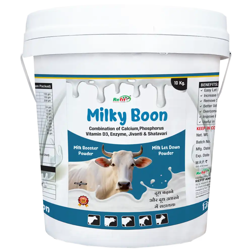 Milkyboon Powder is a premium nutritional supplement designed to support overall health, fertility, and milk productivity in cattle. Enriched with essential vitamins, minerals, and amino acids, it helps optimize performance, immunity, and reproductive efficiency in cows and bulls alike.