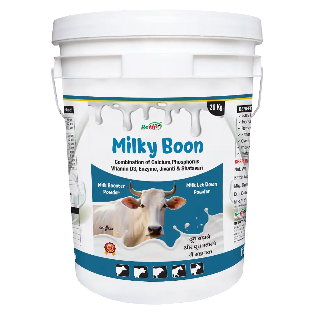 Milkyboon Powder is a premium nutritional supplement designed to support overall health, fertility, and milk productivity in cattle. Enriched with essential vitamins, minerals, and amino acids, it helps optimize performance, immunity, and reproductive efficiency in cows and bulls alike.