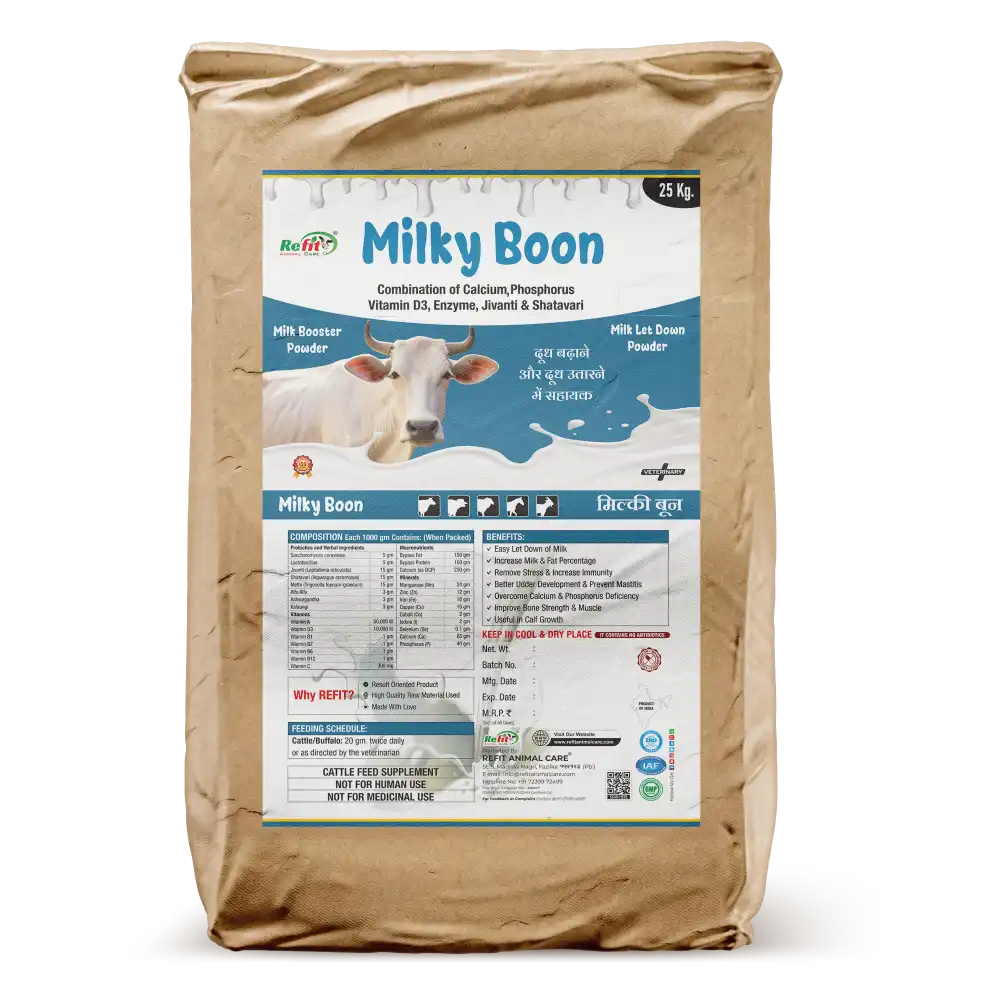 Milkyboon Powder is a premium nutritional supplement designed to support overall health, fertility, and milk productivity in cattle. Enriched with essential vitamins, minerals, and amino acids, it helps optimize performance, immunity, and reproductive efficiency in cows and bulls alike.