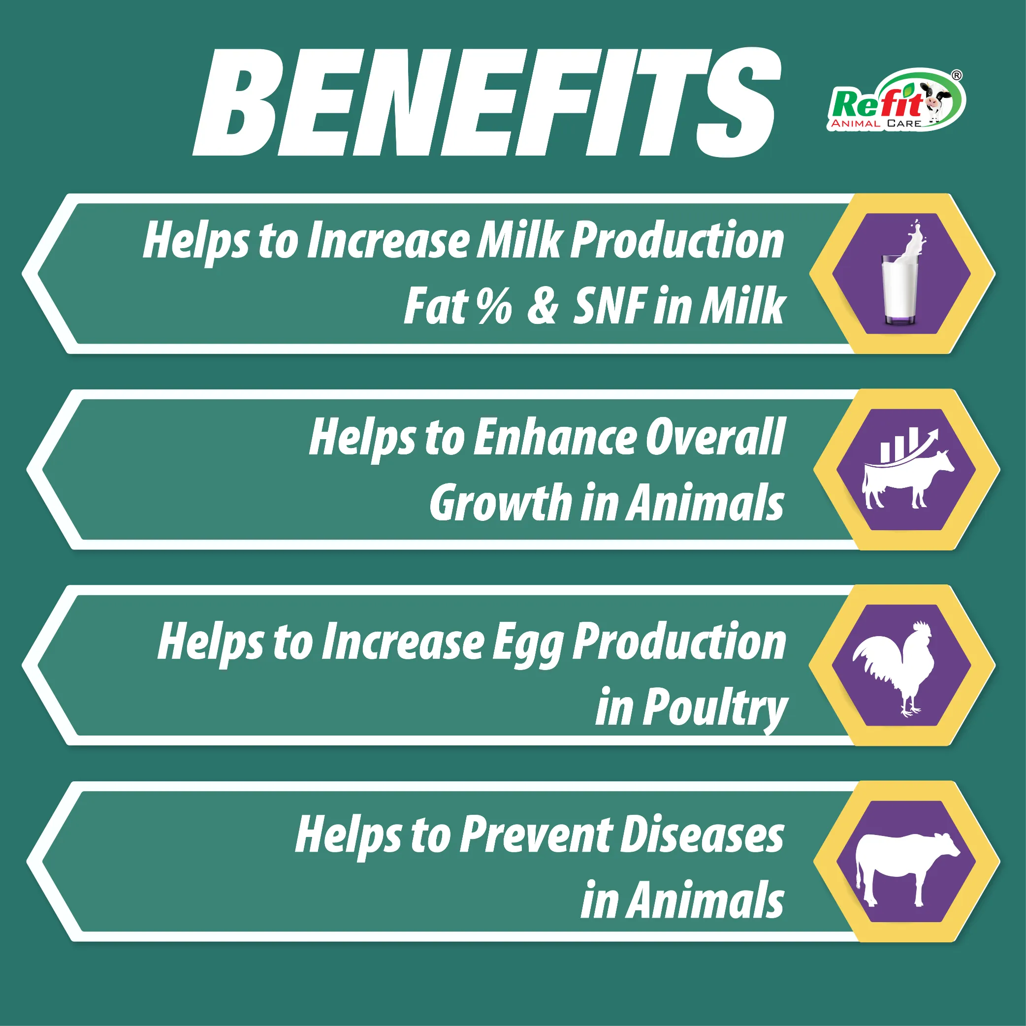 • Increases milk production and feed efficiency in dairy animals