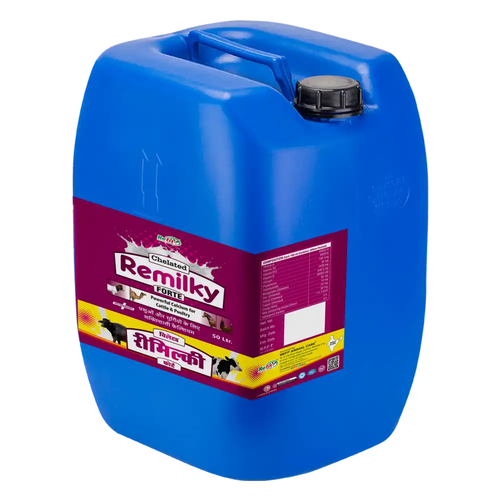 Remilky Forte is a powerful liquid calcium supplement specially formulated for dairy animals like cows, buffaloes, and goats. It provides highly absorbable calcium, Vitamin D3, and essential trace minerals to support bone strength, muscle function, and peak milk production.