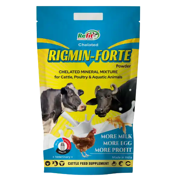 Rigmin Forte, developed by Refit Animal Care, is a premium chelated mineral mixture supplement specially formulated to meet the nutritional needs of cattle, buffaloes, goats, sheep, and other livestock. Enriched with essential macro and trace minerals, it supports healthy growth, immunity, productivity, and reproductive performance.