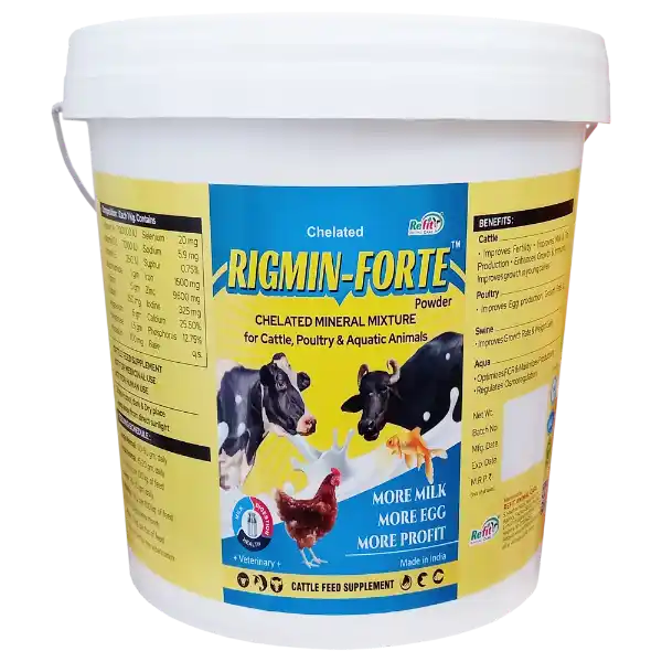 Rigmin Forte, developed by Refit Animal Care, is a premium chelated mineral mixture supplement specially formulated to meet the nutritional needs of cattle, buffaloes, goats, sheep, and other livestock. Enriched with essential macro and trace minerals, it supports healthy growth, immunity, productivity, and reproductive performance.