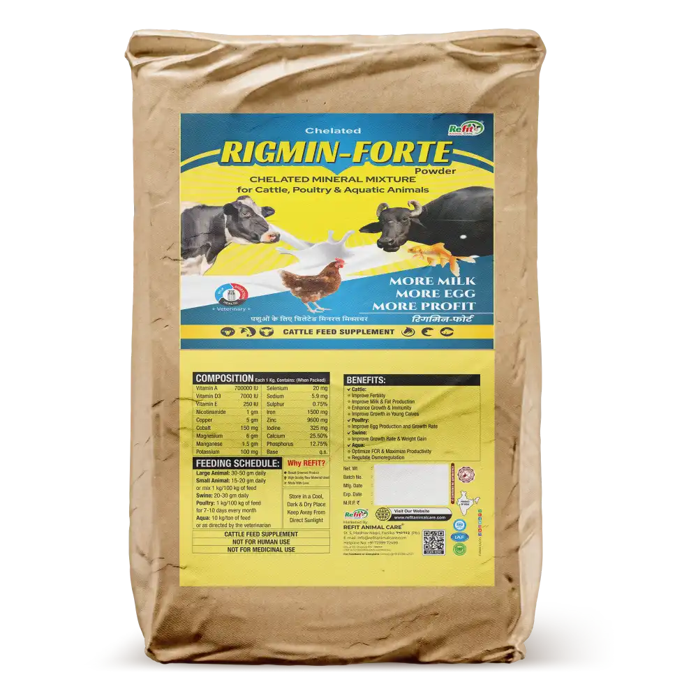 Rigmin Forte, developed by Refit Animal Care, is a premium chelated mineral mixture supplement specially formulated to meet the nutritional needs of cattle, buffaloes, goats, sheep, and other livestock. Enriched with essential macro and trace minerals, it supports healthy growth, immunity, productivity, and reproductive performance.