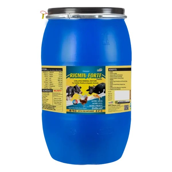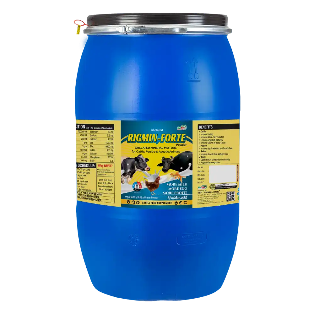Rigmin Forte, developed by Refit Animal Care, is a premium chelated mineral mixture supplement specially formulated to meet the nutritional needs of cattle, buffaloes, goats, sheep, and other livestock. Enriched with essential macro and trace minerals, it supports healthy growth, immunity, productivity, and reproductive performance.