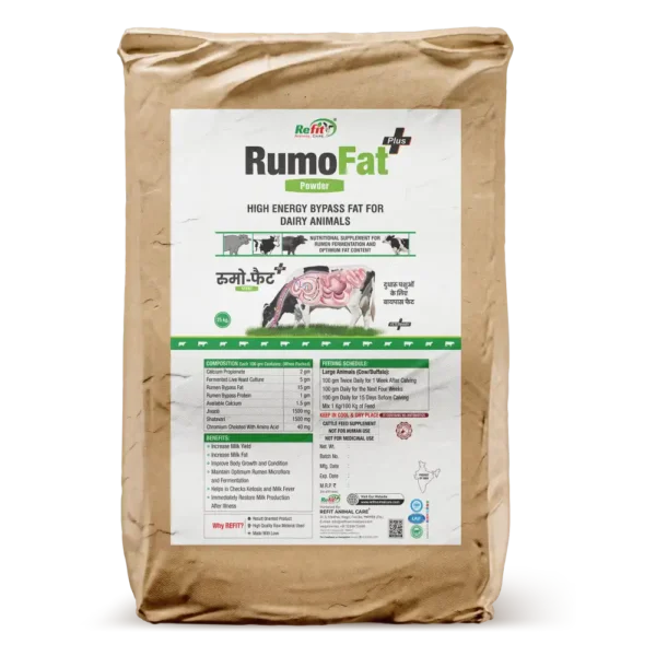 Rumofat is a premium bypass fat supplement designed to provide a highly concentrated source of energy to ruminant animals. Formulated with rumen-protected fats, Rumofat ensures that fats bypass the rumen and are directly absorbed in the intestine, delivering instant, usable energy to support milk production, growth, and reproductive performance.