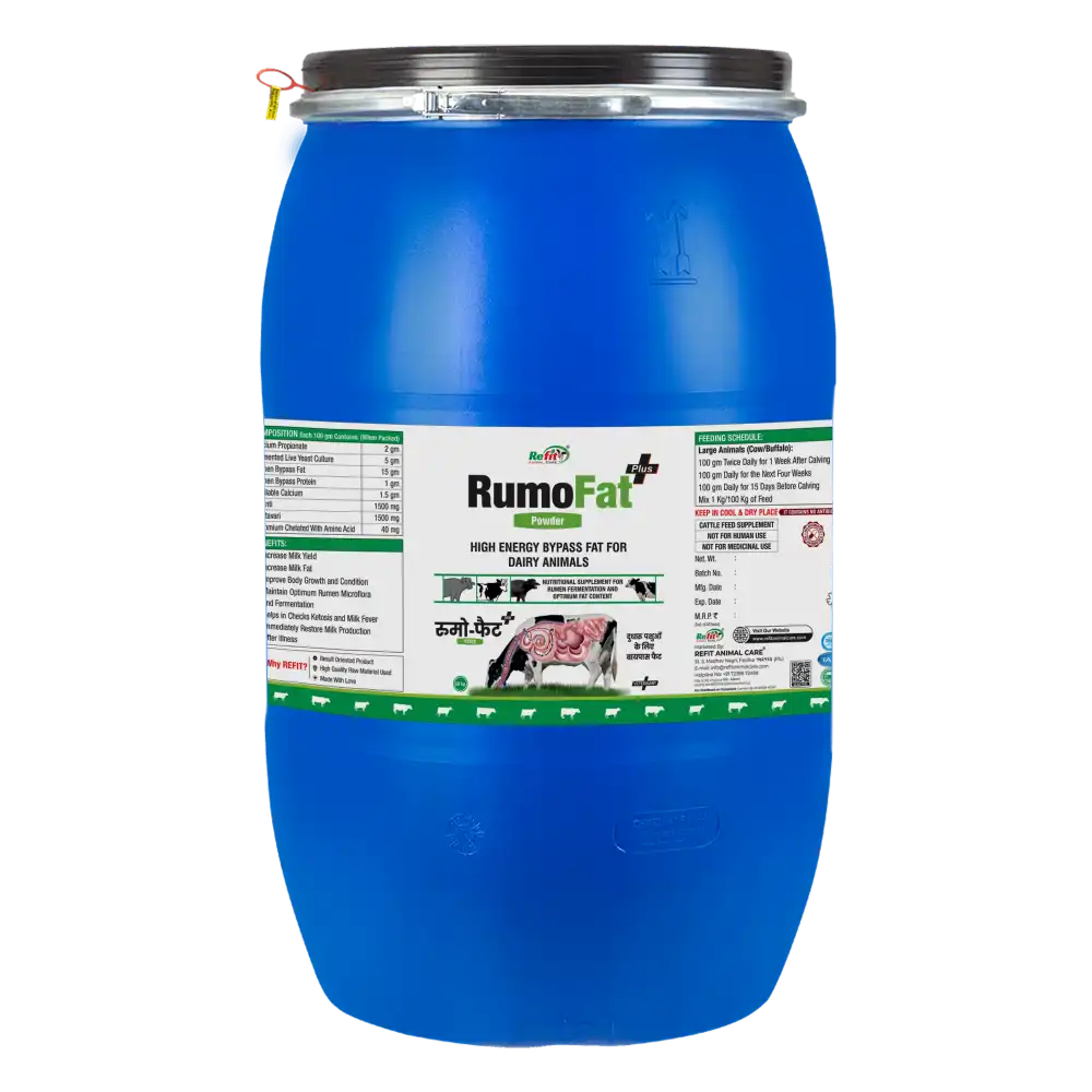 Rumofat is a premium bypass fat supplement designed to provide a highly concentrated source of energy to ruminant animals. Formulated with rumen-protected fats, Rumofat ensures that fats bypass the rumen and are directly absorbed in the intestine, delivering instant, usable energy to support milk production, growth, and reproductive performance.